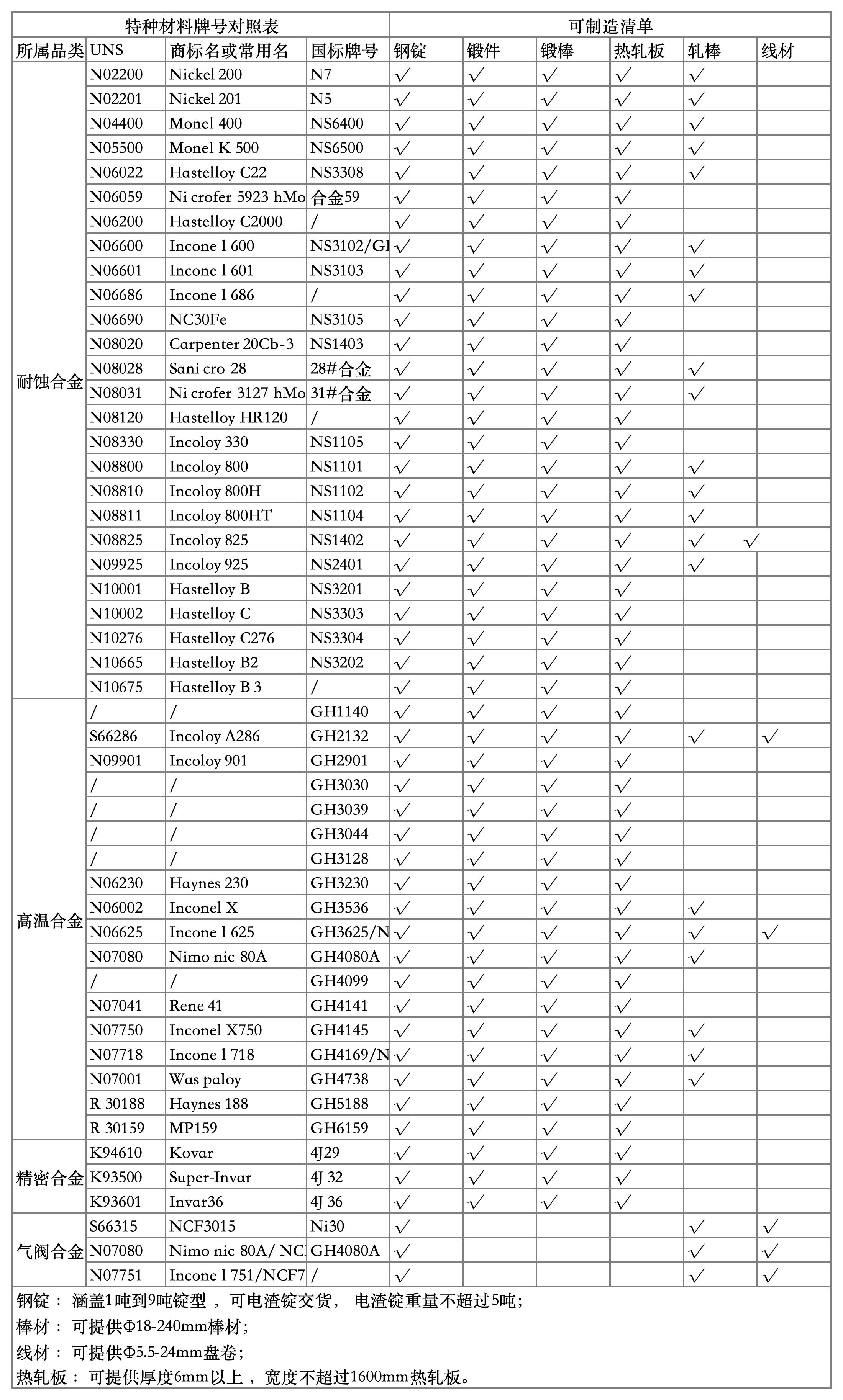 特种材料及可制造清单